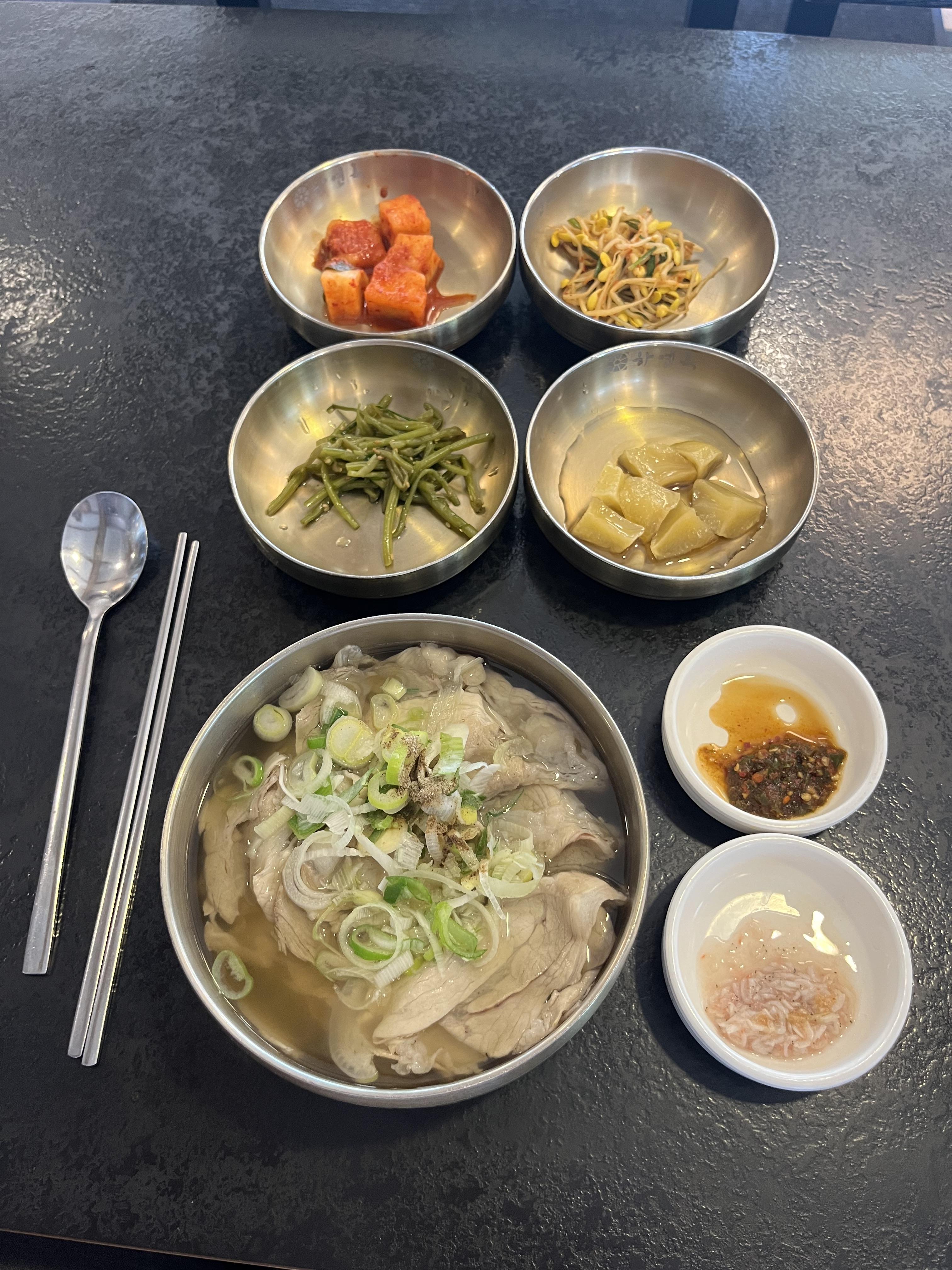 사실 <하연옥>에 오면 메뉴를 고민할 필요가 없습니다. 진주 물냉, 비냉 중에 하나를 고르고 육전을 추가하면 됩니다. 저도 처음 왔을 때 물냉면과 육전을 먹었었지요. 살짝 살얼음이 껴있는 물냉면은 지금 생각해도 침이 고이는 맛입니다. 구수하고 진한 육수에 육전까지 푸짐하게 올려져 있어 한 끼 식사로도 부족함이 없습니다. 하지만 며칠 째 속이 좀 불편했던 저는 밥이 먹고 싶었어요. 지역민에게 <하연옥>의 국밥류도 맛이 좋다는 이야기 이미 들어놨던 터라 망설임 없이 '지리산 흑돼지 맑은 곰탕'을 주문했습니다. 물론 손님들 대부분은 냉면과 육전을 드시고 계셨습니다.