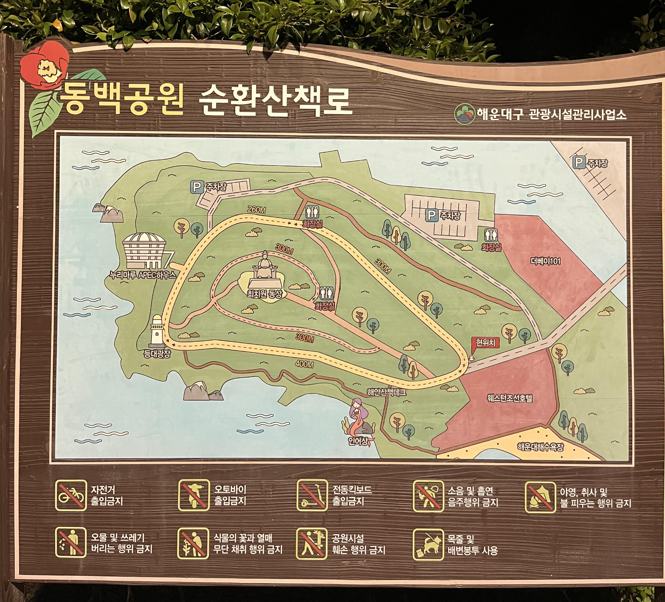 동백섬 입구로 들어가면 눈길은 자연스레 더베이 101과 마린시티가 보이는 우측으로 향하게 됩니다. 그리고 정면에는 웨스틴 조선호텔이 보이는데요. 그 왼쪽으로는 넓은 해운대 바다가 펼쳐져 있습니다. 들어오던 방향 그대로 쭉 걸어가면 동백섬 입구가 나오지만, 저는 오늘 더베이 101쪽으로 갑니다. 이 방향이 동백섬 밤산책에 더 적합한 이유가 있기 때문입니다.