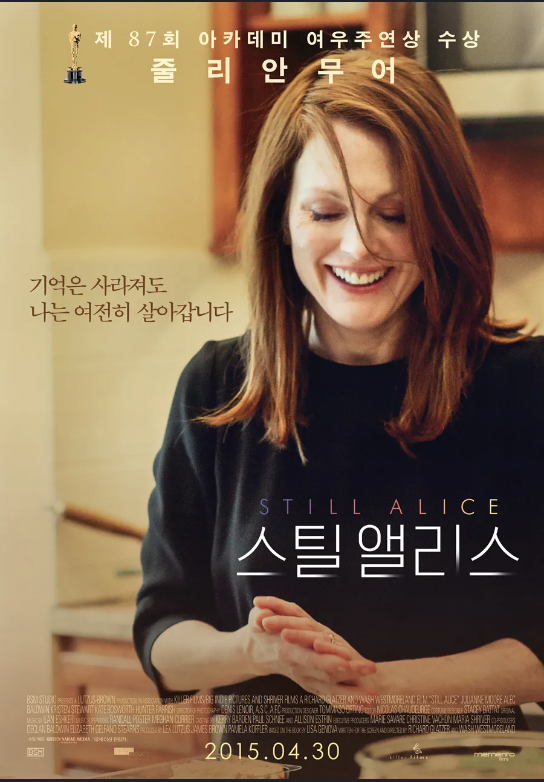 <스틸 앨리스>는 뇌과학, 정신건강, 심리학 등과 관련된 책을 읽을 때 자주 언급되는 영화입니다. 그래서 언제 가는 꼭 보리라 하고 따로 메모를 해두었었죠. 그리고 며칠 전 시간이 좀 생겨 드디어 이 영화를 넷플릭스에서 보았습니다. 저는 넷플릭스 영화는 왠지 한 번에 보지 못하는 경우가 많은데요. 이 작품은 중간에 화장실 한 번 다녀오고 끝까지 다 봤습니다. 작품 자체도 매력적이었고 많은 좋은 배우들도 등장했는데요. 특히 치매에 걸린 주인공을 연기한 줄리안 무어의 모습이 무척 인상적이었습니다. 치매에 걸린 주인공과 가족들의 이야기를 담은, <스틸 앨리스>를 소개합니다.